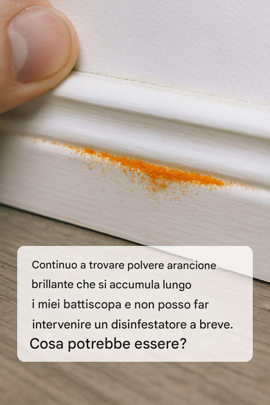Scoprire della polvere arancione brillante che si accumula lungo i battiscopa può essere al tempo stesso sconcertante e preoccupante. Questo insolito fenomeno potrebbe indurvi a chiedervi quali siano le sue origini e se sia indice di un problema più grave all’interno della vostra casa. In attesa di un intervento di disinfestazione o di una valutazione professionale, è essenziale esplorare le potenziali cause e considerare possibili soluzioni per mitigare il problema.